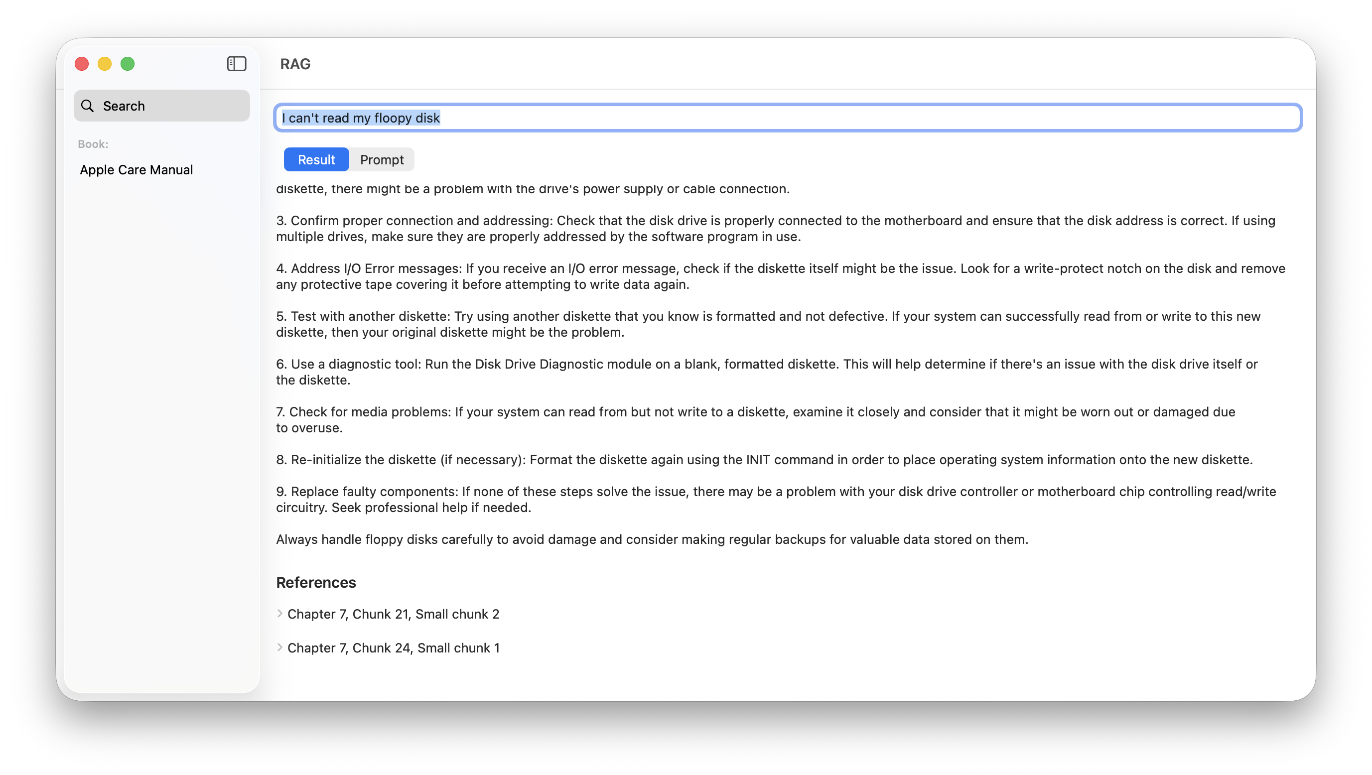 RAG stands for Retrieval Augmented Generation. It was a first attempt to make LLMs more useful by allowing them to work with the user's data and is specially important in enterprise environments. This demos illustrate the concept by allowing the user to search an old 80's Apple II maintenance book. It is meant to demonstrate what customers could achive by providing their employees access to all their policy and procedure documents. This demo uses granite:embeddings, a free multilingual transformer from IBM to generate the embeddings locally and granite:.
